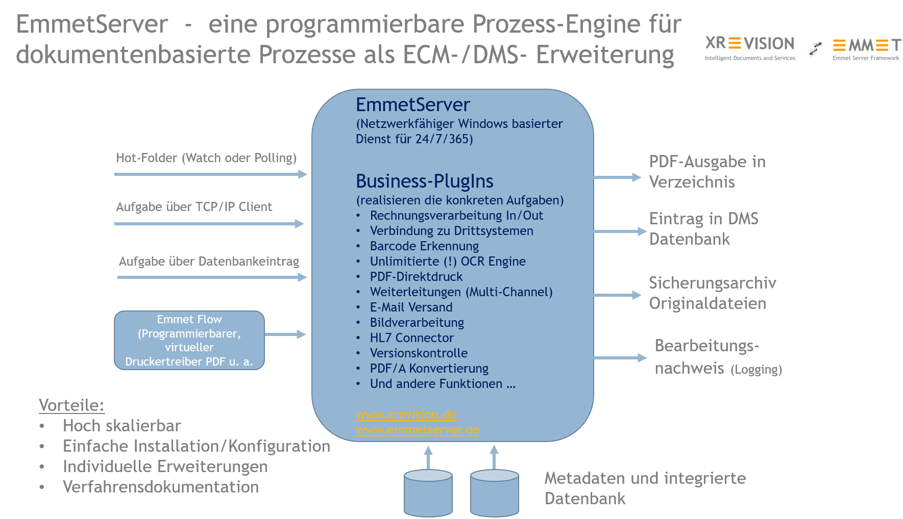 von XREVISION sein. EmmetServer ist ein mit Plug-Ins konfigurierter Dokumenten- und Prozesserver. Er analysiert Dokumenteninhalte, verarbeitet diese und kann Abläufe auslösen oder 'normierte' Dokumente an Schnittstellen anderer Systeme liefern.